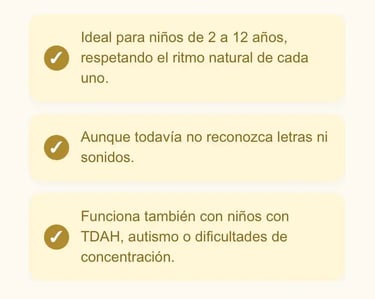 Este material está indicado para niños de 2 a 12 años, incluso con trastornos del neurodesarrollo como TEA, TDAH y TOD.
